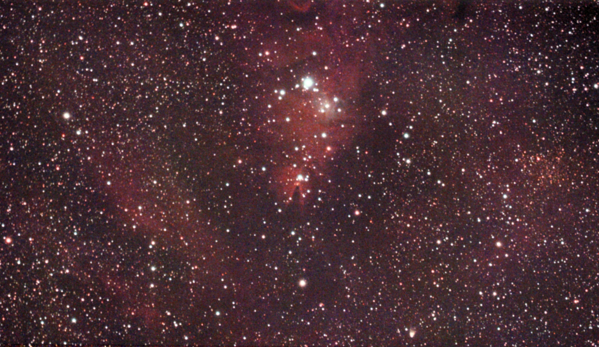 At the feet of Castor. As the heading implies, this region of space is found where the stars of Gemini form the feet or in this case, foot of Castor, the twin of Pollux. It is a deep image showcasing the various nebulae in the region including a section of Orion at the bottom. The two orange looking bright stars are Propus (Eta Gem) upper centre with the Jellyfish Nebula (IC 433) to its left and further to their left Tejat Posterior (Mu Gem) which has several fainter patches of nebulosity above it. At the very top, half in the shot is M35 and it's smaller companion cluster, NGC 2158. Towards the bottom right is the bright nebula called the Monkey Head Nebula, NGC 2174, technically the monkey head is upside down! Image taken with the RedCat 61 WIFD Refractor, Canon R8 and Quad filter, stack of 208 x 1 minutes exposures @ ISO 10000 taken on Feb 2nd 2025.