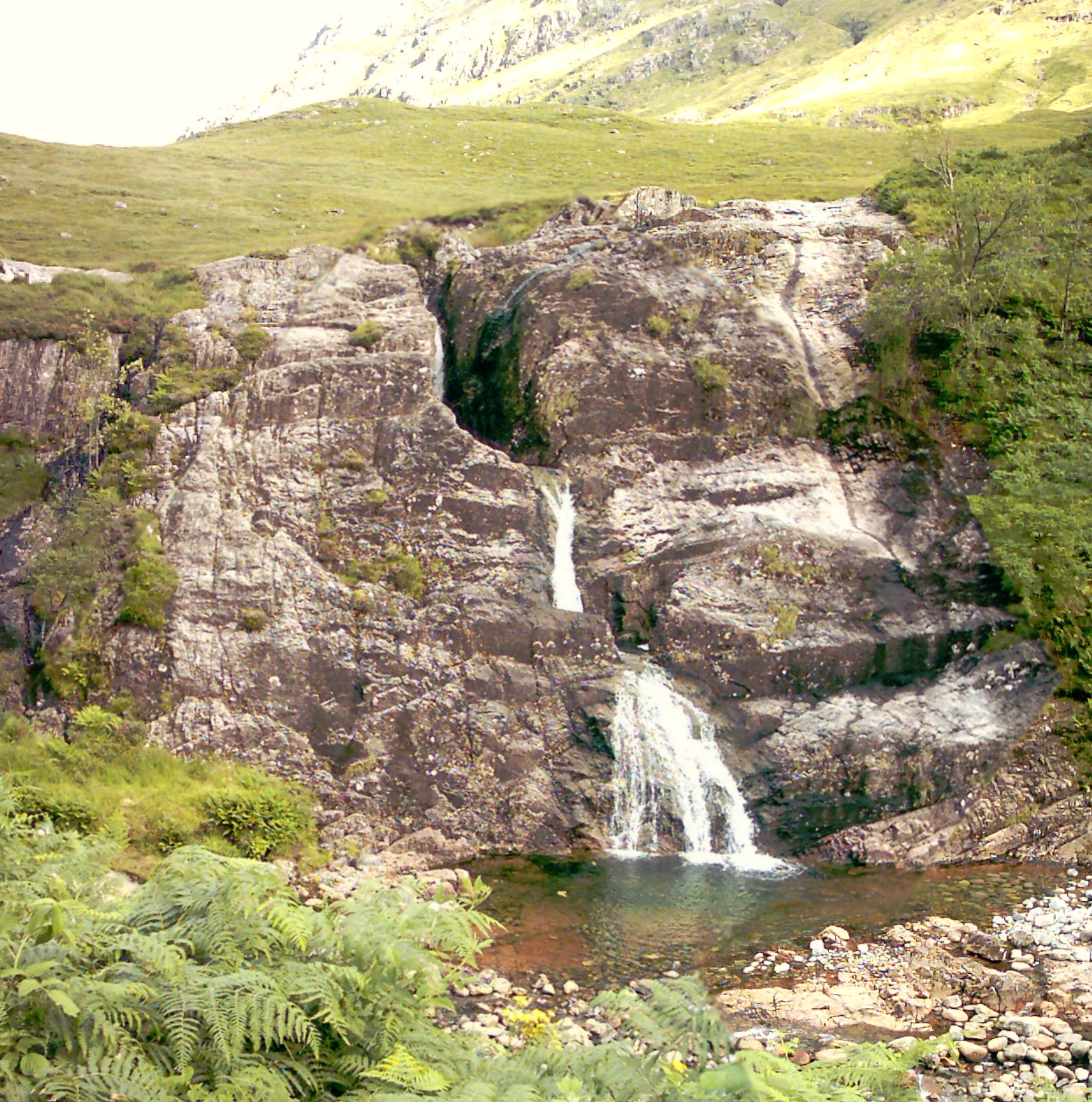 Waterfall near the start of Glenn Coe in Scotland. The hill behind rises up to Stob nan Cabar at the back.